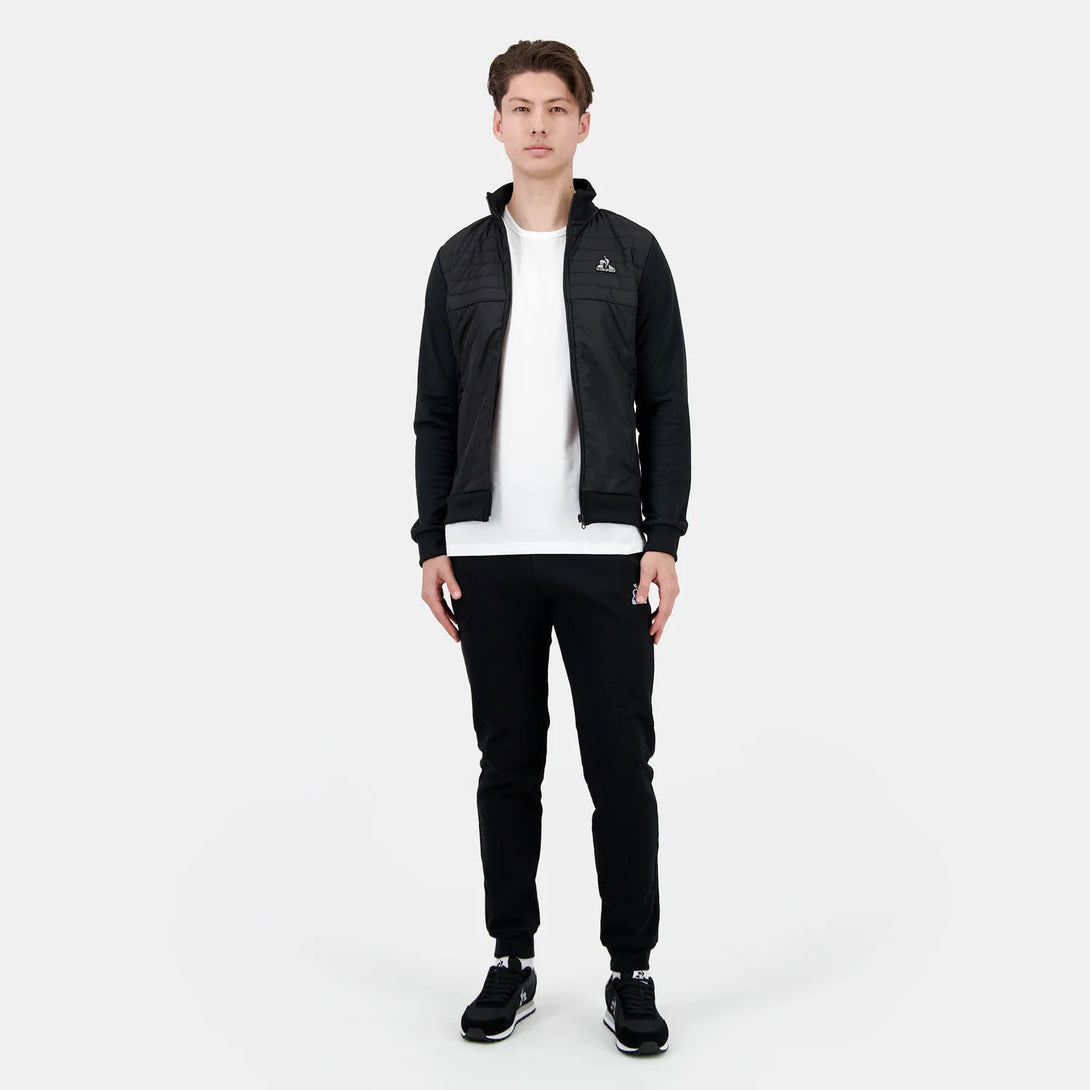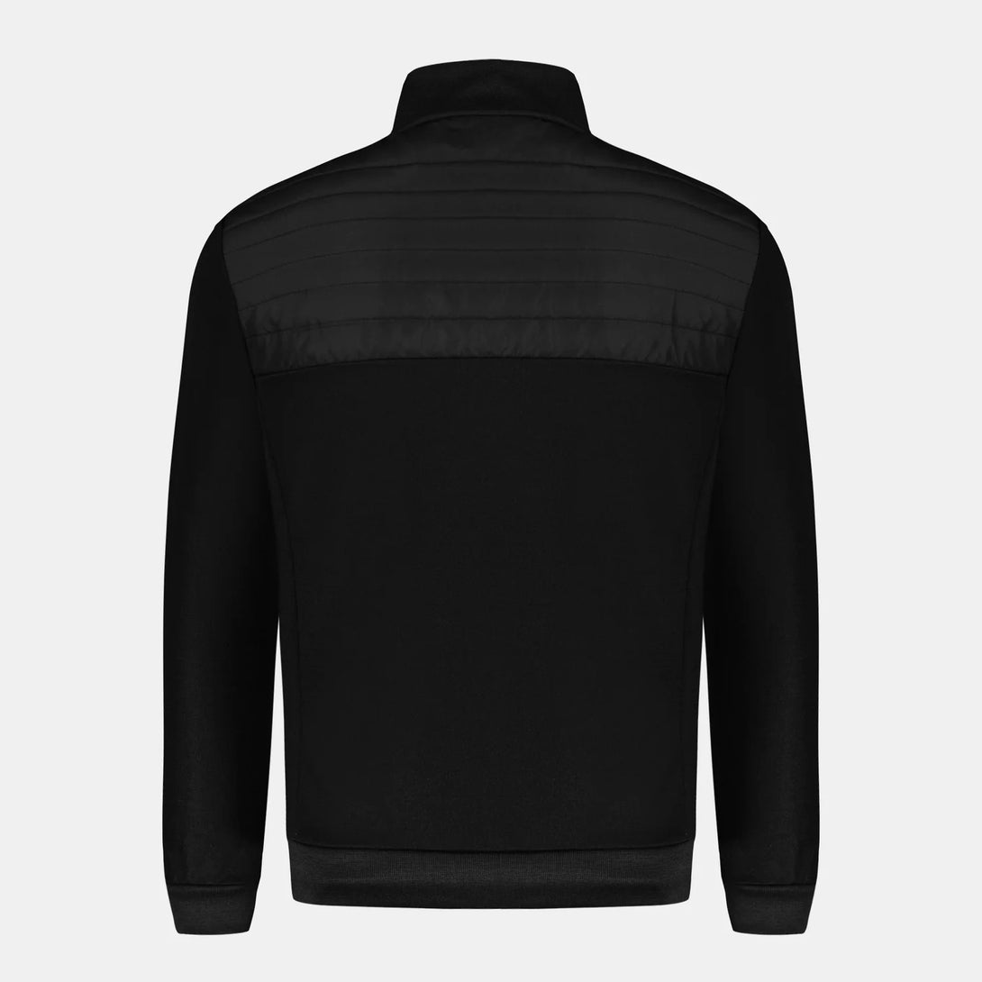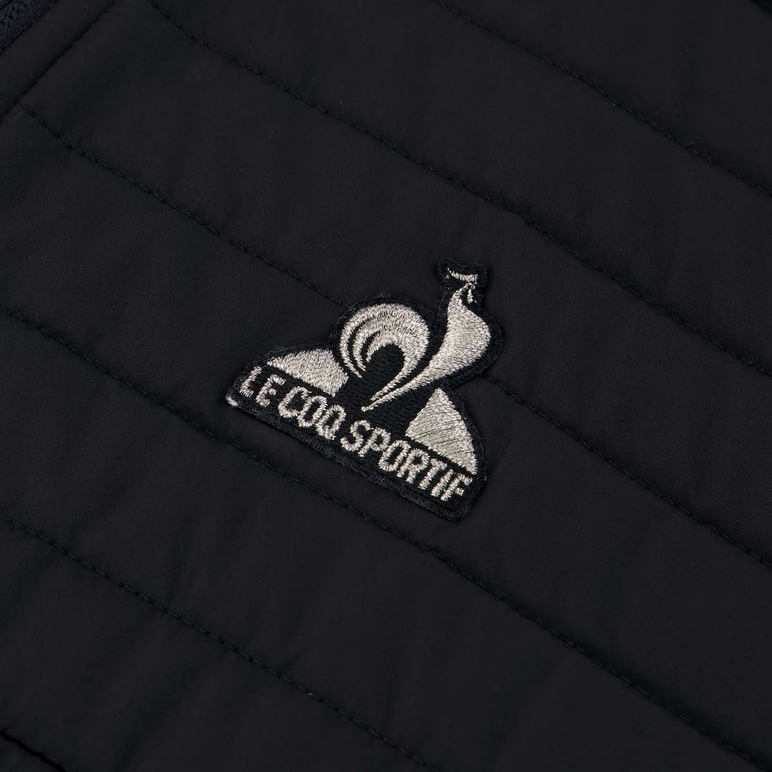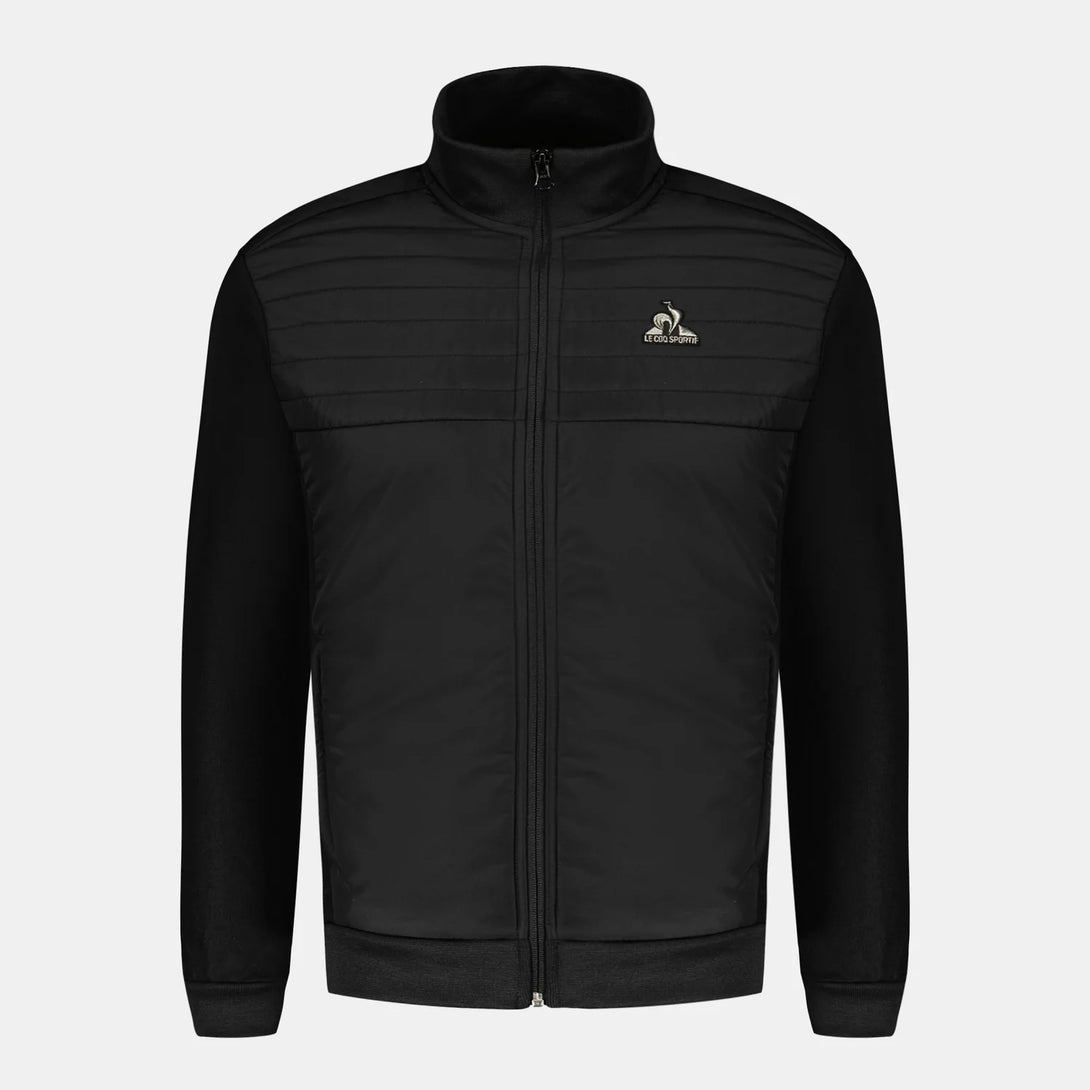 Esta chaqueta híbrida para hombre combina funcionalidad y estilo con un cuerpo de poliéster urdimbre y trama repelente al agua que garantiza protección ligera contra la humedad. Los paneles laterales, mangas y parte baja de la espalda, elaborados en interlock de algodón y poliéster (290 g), aportan comodidad y movilidad. Presenta un corte clásico, cremallera central, bolsillos laterales con cierre y bolsillo de microfibra para mayor practicidad. Su interior acolchado y forrado ofrece calidez, mientras que los acabados acanalados en puños, cuello y bajo aseguran un ajuste perfecto. La insignia bordada "Logo du Coq Argent" realza su acabado premium.