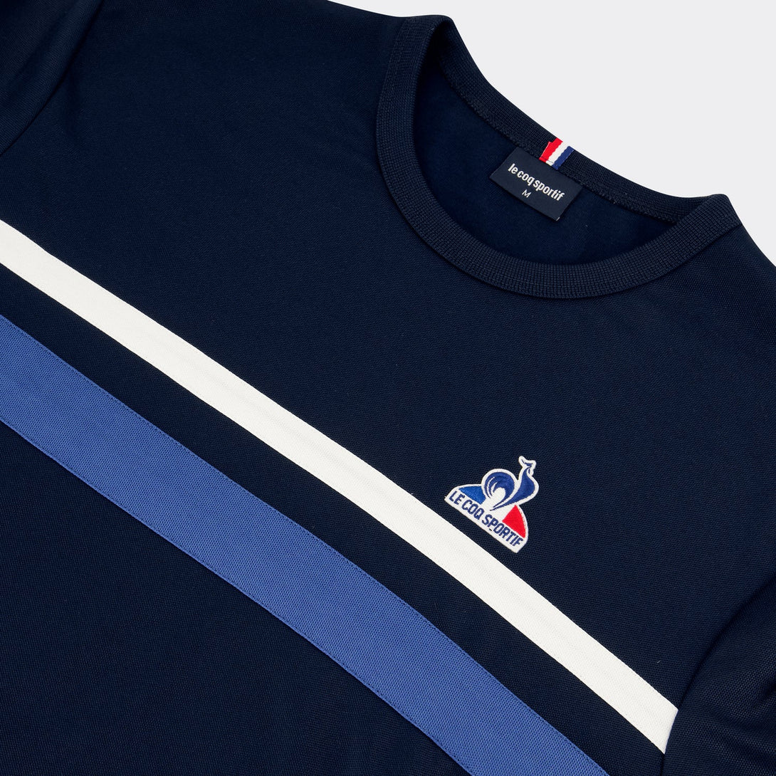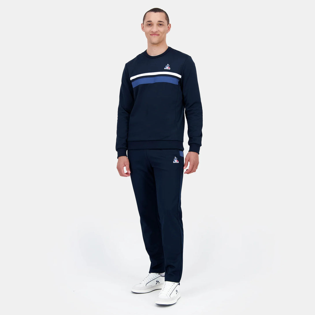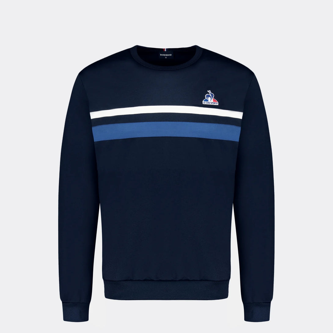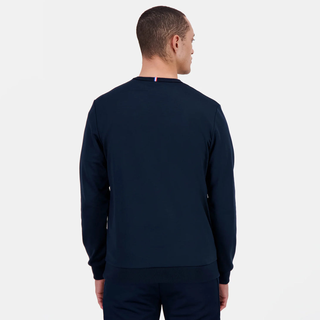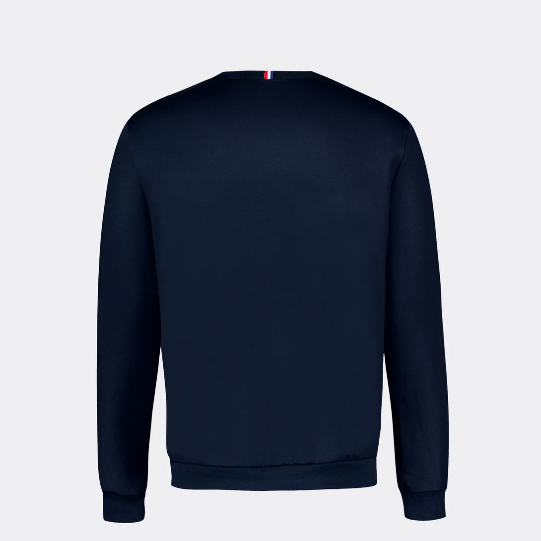 Este buzo sin capucha para hombre, en un elegante azul marino, combina comodidad y estilo gracias a su tejido interlock de doble punto (55 % algodón y 45 % poliéster). Su corte regular ofrece un ajuste clásico, mientras que las rayas en contraste en el pecho aportan un detalle distintivo. El canalé 1x1 en cuello, puños y bajo garantiza un ajuste duradero. La insignia bordada del "Logo du Coq" en el pecho añade un toque de autenticidad. Perfecta para usarse con los pantalones rectos azul oscuro de la misma colección y completar un look sofisticado y cómodo.