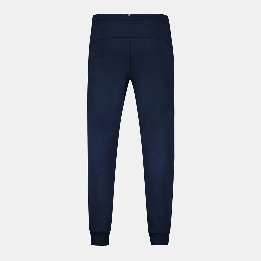 Este pantalón azul marino combina algodón y poliéster en un tejido de 300 g doble cara que garantiza suavidad y durabilidad. Su corte regular proporciona un ajuste cómodo y clásico, ideal para uso diario. La cintura elástica con cordón exterior y los dos bolsillos laterales inclinados aportan funcionalidad y comodidad. Detalles como el canalé 1x1 en cintura y bajos y la insignia bordada "Logo du Coq" en la pierna izquierda destacan su diseño cuidado y autenticidad. Perfecto para quienes buscan estilo y confort en una prenda versátil.